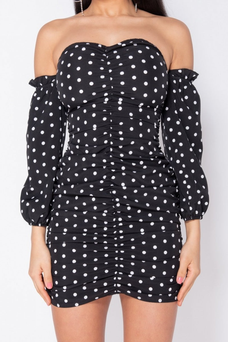 This bardot polka dot mini dress featuring ruching detail & long sleeves is perfect for any night out. Team it with strappy heels & clutch for ultimate style goals!