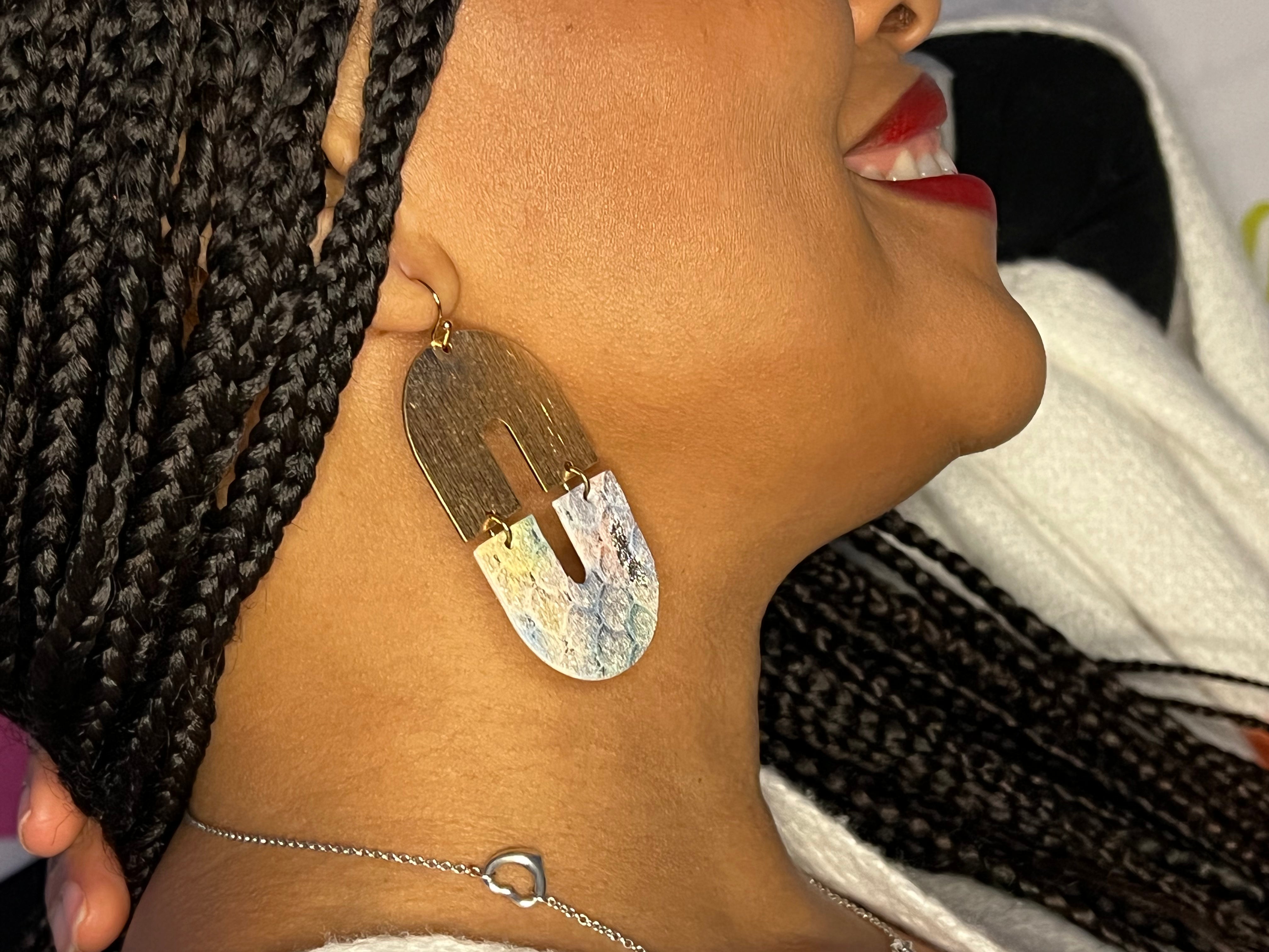 Description: Half metal half leather Oval hoop earrings. Made of brass with brushed surface and faux leather with pastel colors. Size: 1.25" x 2.75"