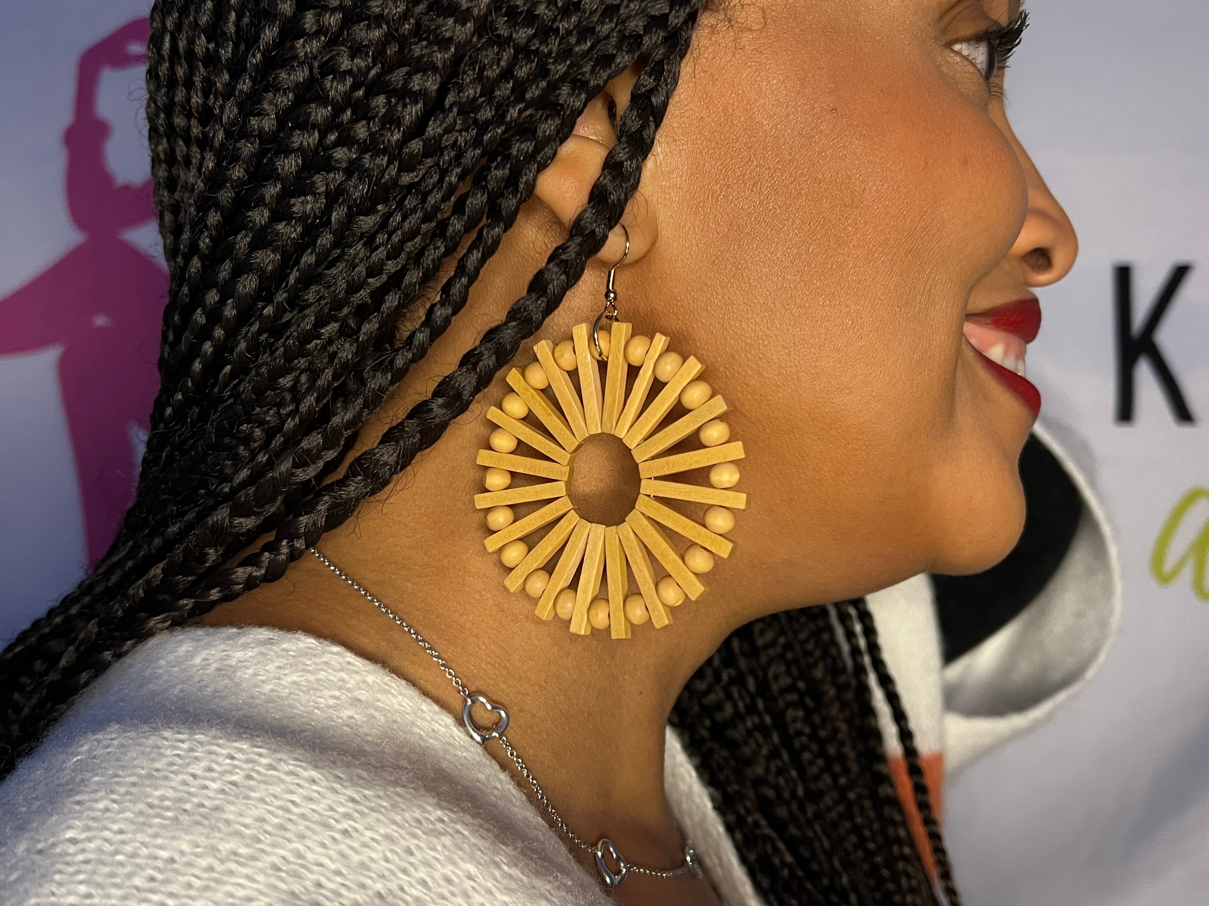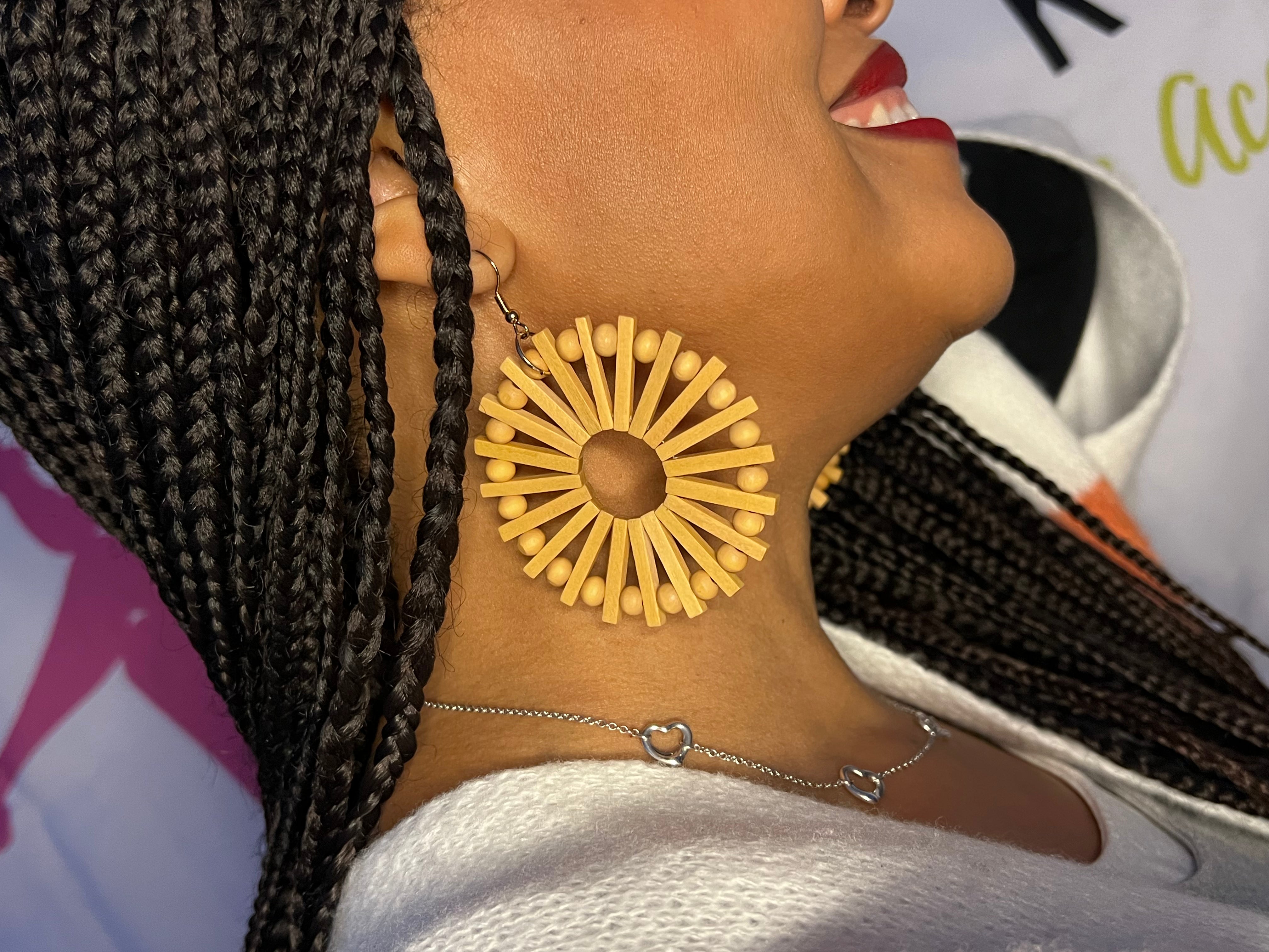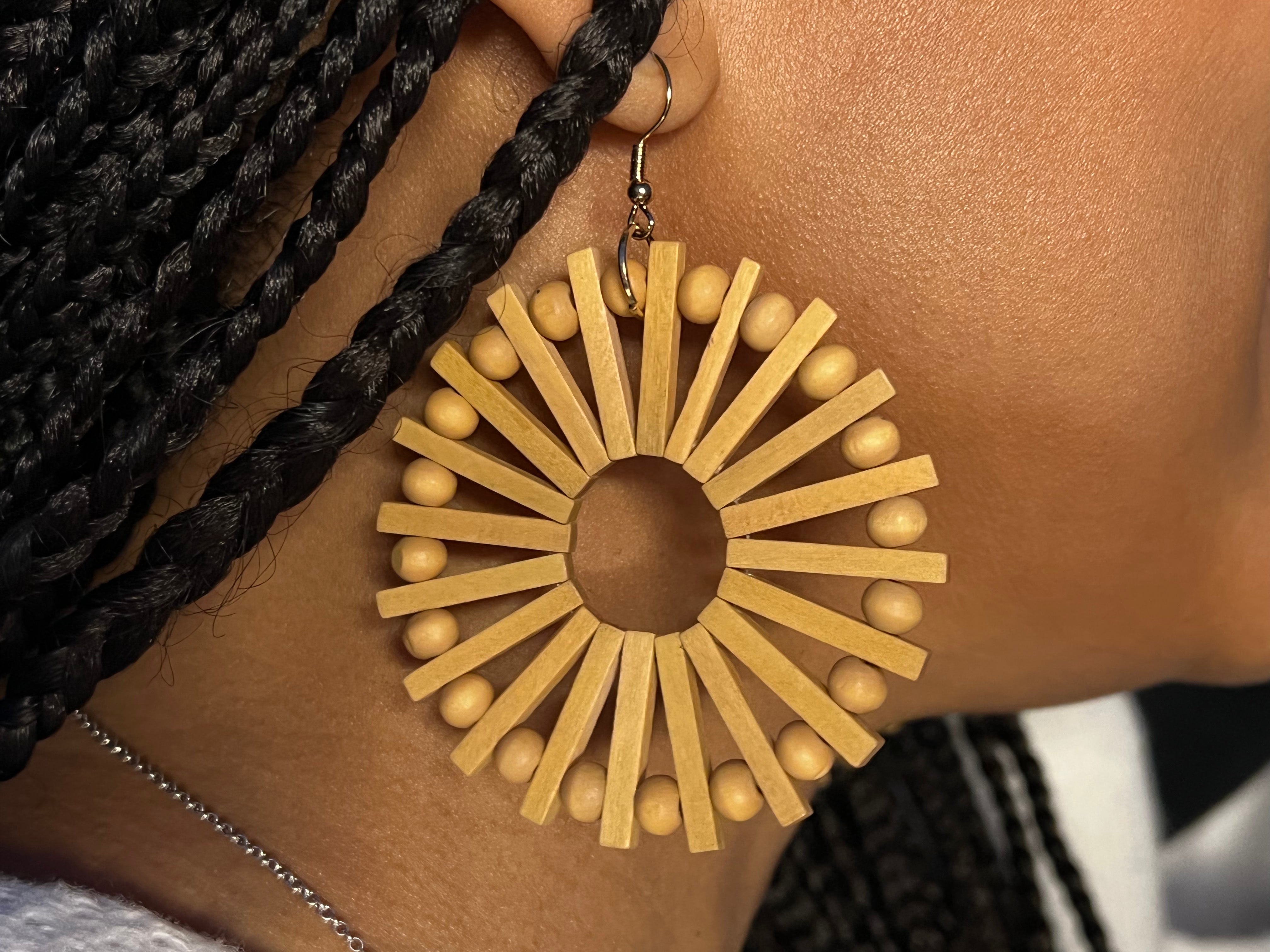 Description: Statement piece made of wood, wheel drop earrings. Handmade with wood sticks and beads. Size: 2.5" x 3.0"