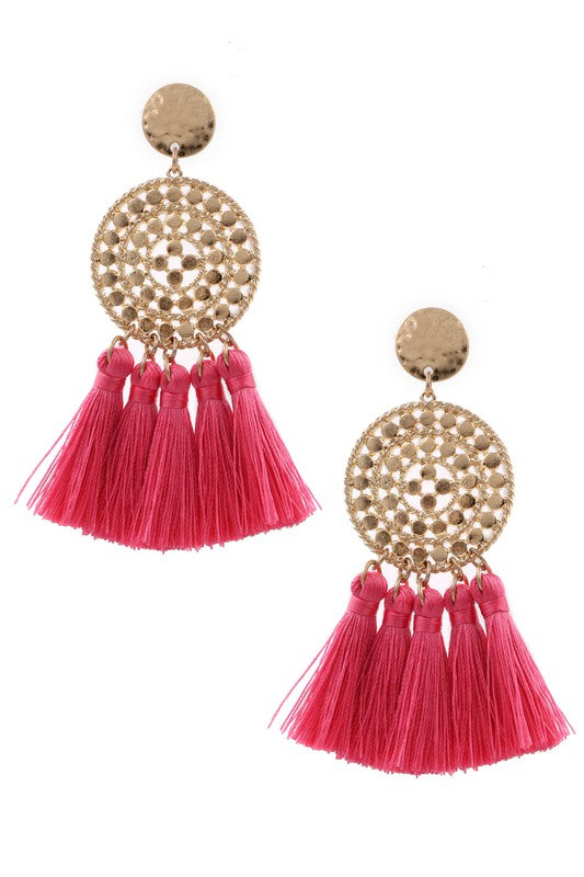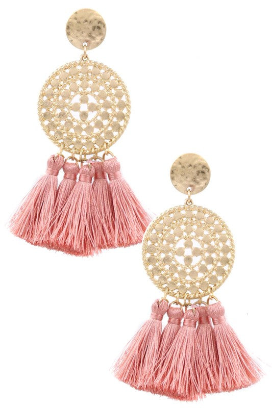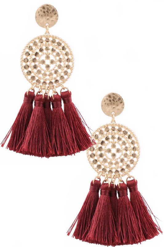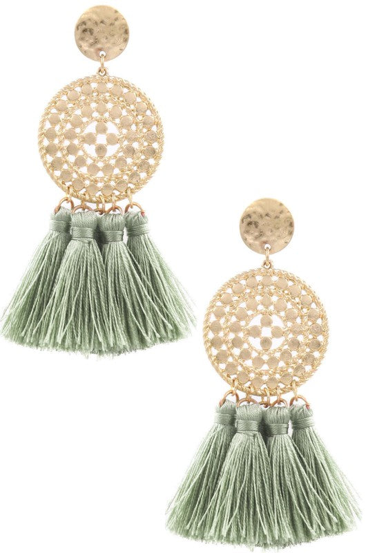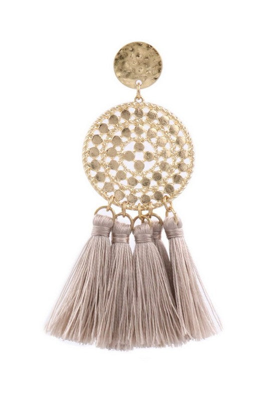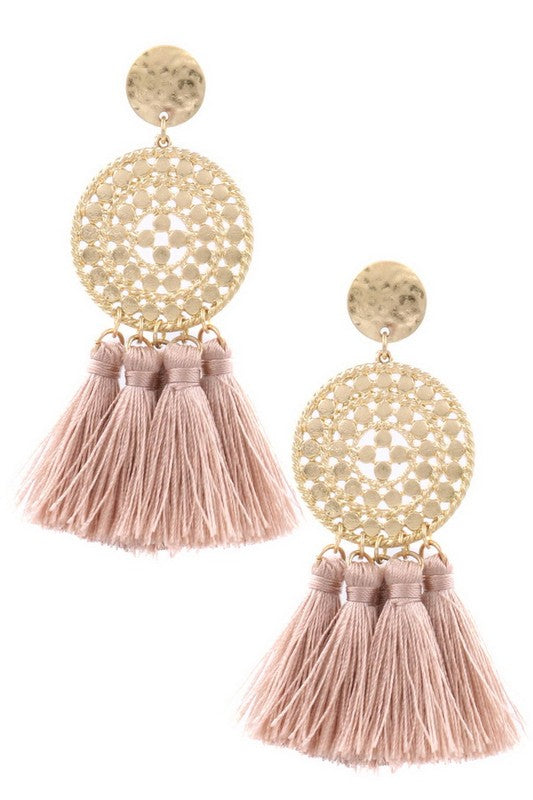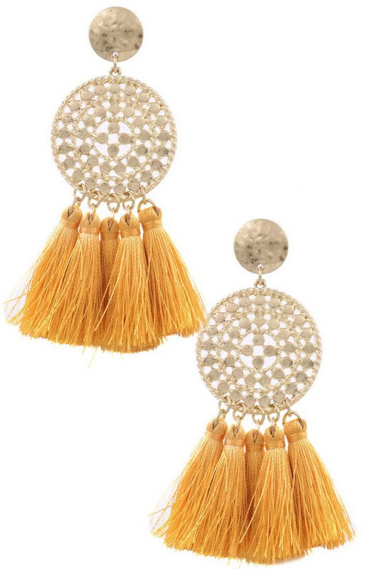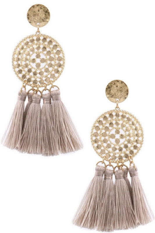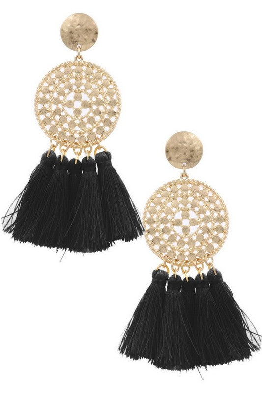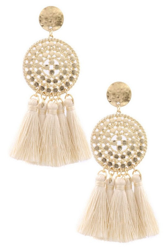 Hammered metal cut out disc cotton tassel drop earrings Length: 3" post back