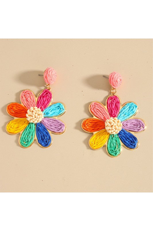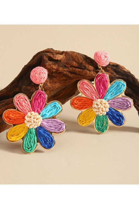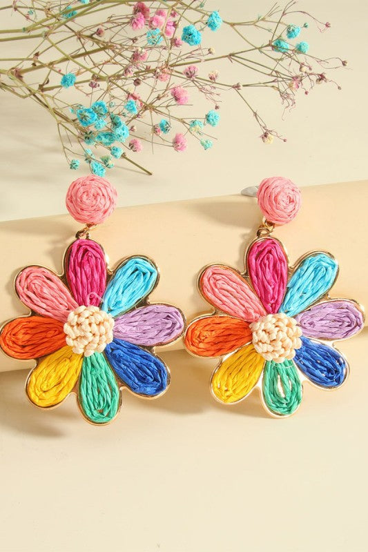 Boho Rainbow Raffia Woven Flower Earrings