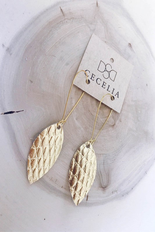 Our leather drop earrings are handmade in Minnesota. You plant one tree with each purchase! Our leather drop earrings are handmade with genuine and faux leather, and gold plated stainless steel earring posts. 3" long by .5" wide.  |