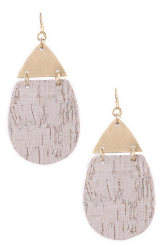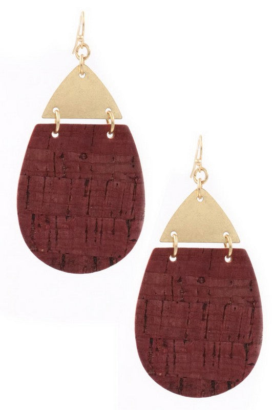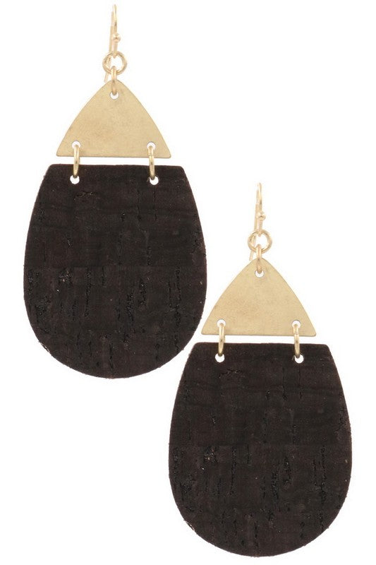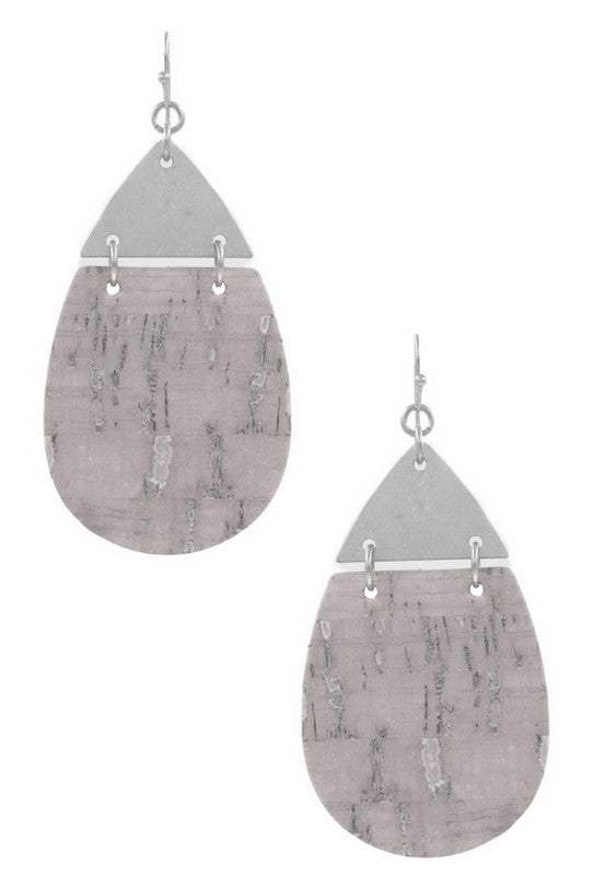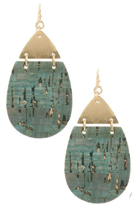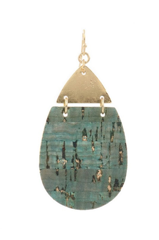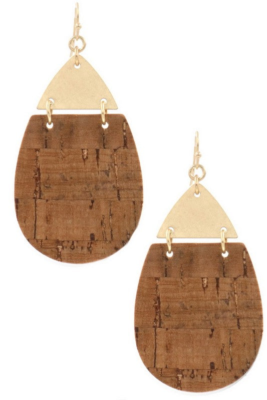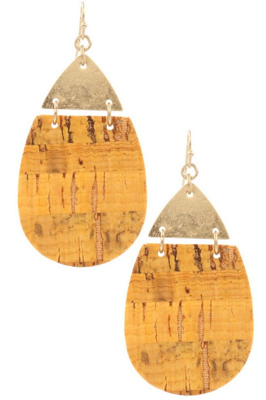 Hammered metal teardrop wood cork design drop earrings Earring drop: 3" Fish hook ear wire